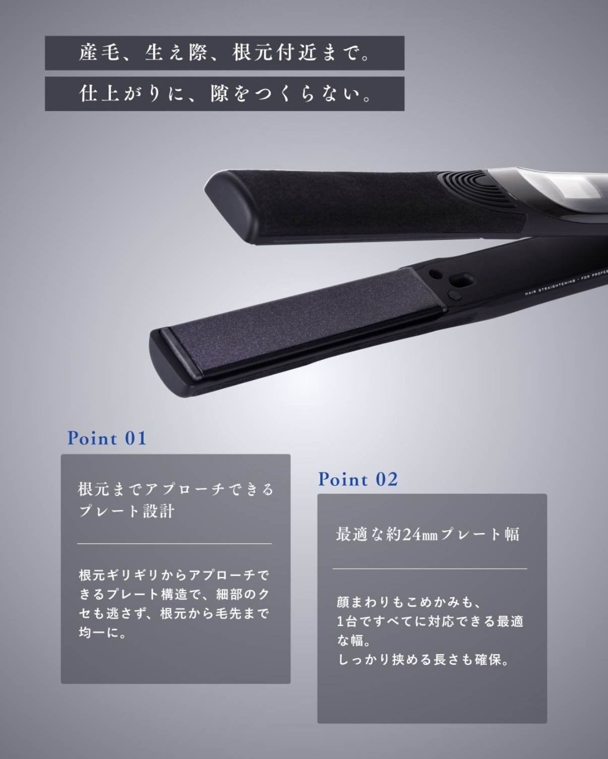 産毛や生え際など、これまでアプローチが難しかった部分にもフィット。細部までしっかり挟み込み、根元から均一に整えます。